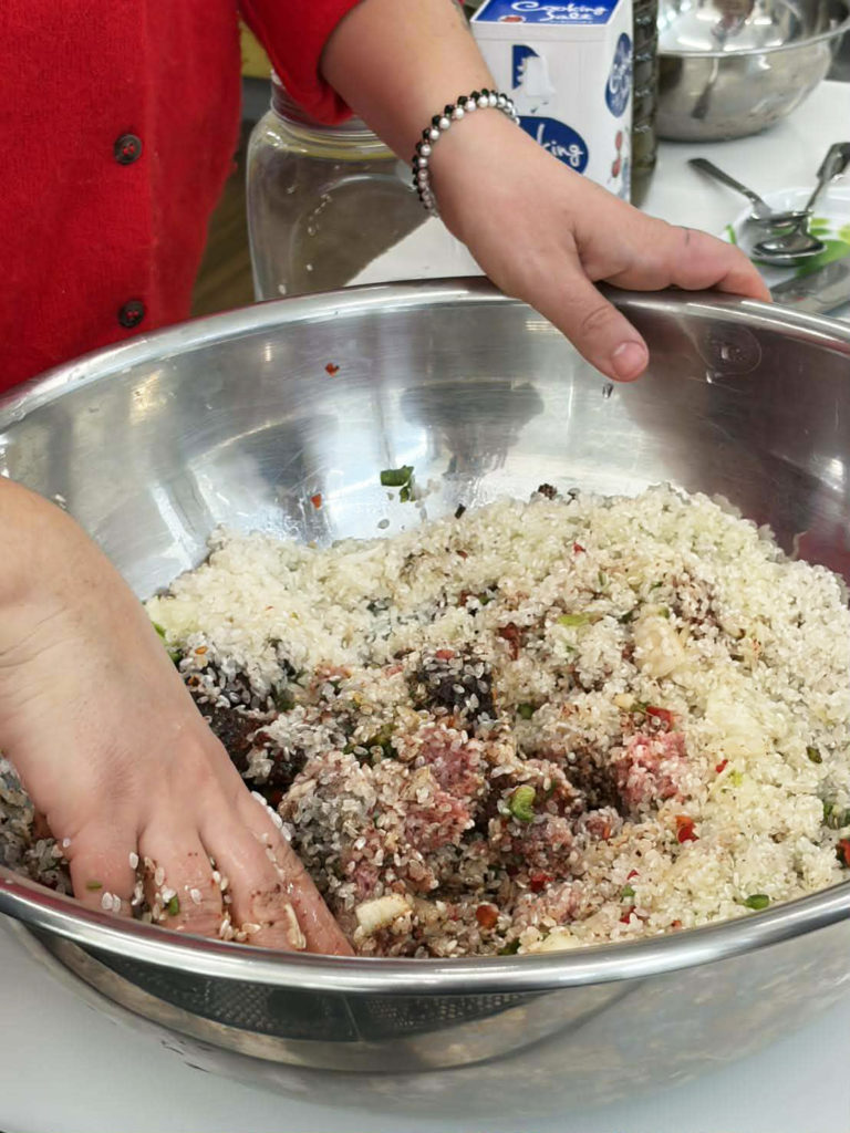 「クルドは大家族だから、たくさん作るのはお手の物なのよ」と笑い、大きなボウルで手際よく材料を混ぜていく姿は、まるで魔法のよう!